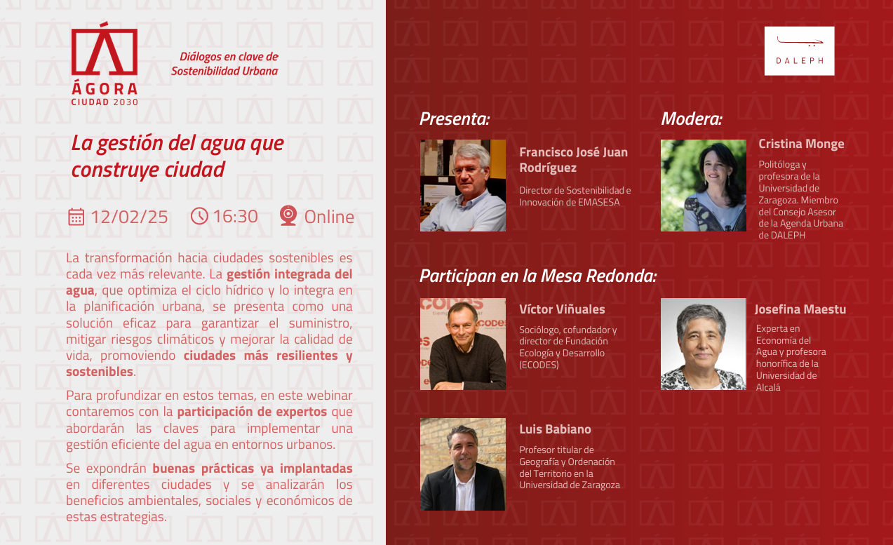 Para profundizar en estos temas, el próximo miércoles 12 de febrero a las 16:30 h se celebrará el webinar “La gestión del agua que construye ciudad”, organizado por Daleph dentro de la iniciativa ÁGORA DE LA CIUDAD 2030. En este evento, contaremos con la participación de expertos que abordarán las claves para implementar una gestión eficiente del agua en entornos urbanos.